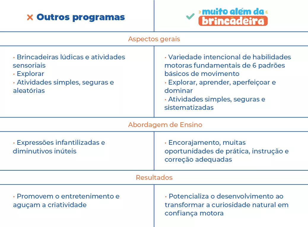 O programa "Muito Além da Brincadeira" concentra, em um único lugar, os estímulos motores que crianças de 1a6m a 3 anos precisam em termos de atividade física e movimento. O programa conta com atividades atrativas, simples, seguras e sistematizadas para crianças pequenas.